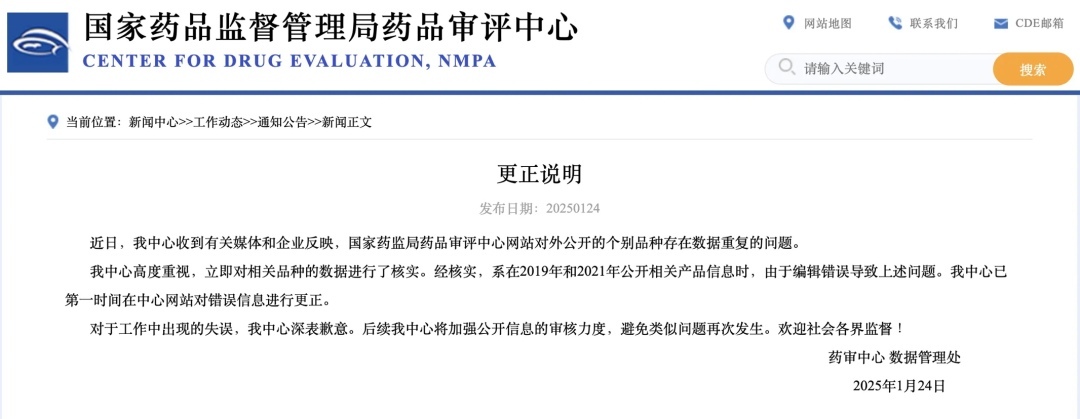 1月24日下午,国家药品监督管理局药品审评中心发布更正说明: